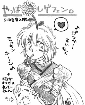 アサの亜希也でログインしてるときは1日1GDてなカンジです。 発見して声かけてもへんじがないただのしかばねのようだな時は たいがい体力回復AFKしています。なかのひとは不在気味? 頭に花口に花で激しく頭よわそうだねえという話を LEDたんJr.のSivaたんとしていた時に浮かんだ一品。