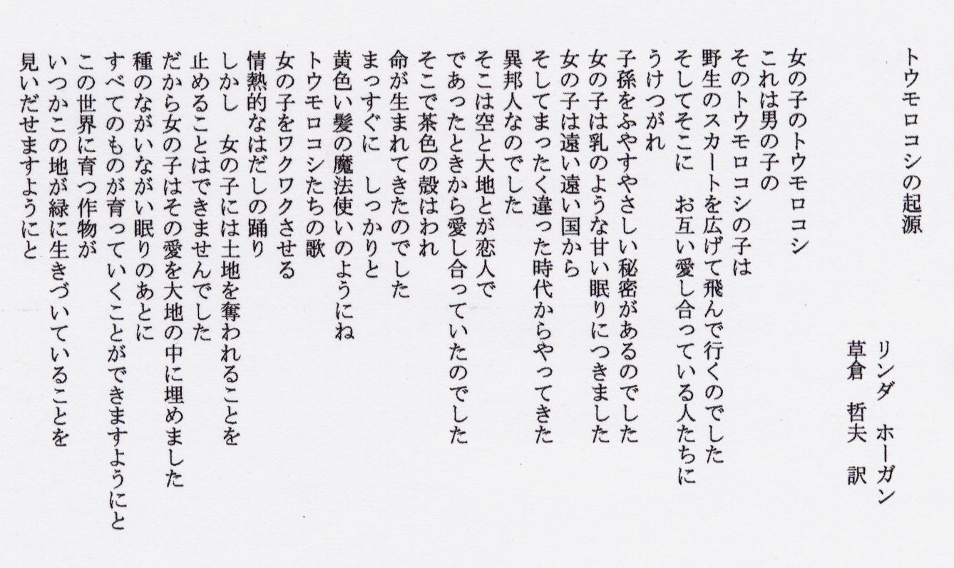ニューヨークのブロードウェイの南の終点近くにグランドゼロがあり、同時にそこはウオール街である。ウオールとは、柵、つまり外敵の侵入から、町を守った柵があった場所を意味している。そこに今は、大きな博物館があり、「ネイティブアメリカン展」をやっていた。そこで一冊の詩集を買った。200円もしない簡素なペーパーバックの詩集である。読んでとてもおもしろかったので、訳してみた。職業柄、なにぶん何十年と英語とは無縁だったので、間違いがあるかもしれない。指摘していただけるとありがたい。