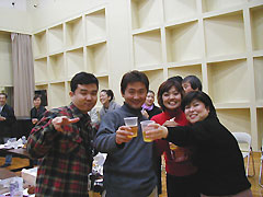 1月5日 初の試みも終了! みんなで打ち上げです。 このイベントのヴィジュアルサポートのりょうせんさん、 パーカッションの屋比久理夏さん、そしてコントラバスの 原国さんと一緒に、おつかれぇ〜〜〜! |
