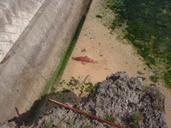 1月16日 港付近に1メートル近くあろうかという 大きなイカが打ちあがりました。このあと これを発見したおじさんが今日食べるんだと いって持って帰りました。 |