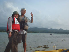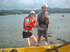 7月16日 千秋&Ryu 遥か向こうに見えるのはカヤックを漕ぎ出した 沖縄本島です。 |