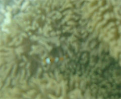 6月14日 とても見づらいですが、クマノミの赤ちゃんが いました。ここには少し前まで大き目のクマノミ もいましたが、突然いなくなりました。最近乱獲 も進んでいるようなので残念です。 |