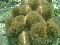 7月21日 今帰仁 観光客がほとんど来ない海岸には、浅瀬でもクマノミに 出会えます。最近密漁も多いようですが、この子供クマノミ も無事に育ちますように。 |