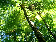 7月21日 名護岳 綺麗な沢を歩いていると木漏れ日がとても心地いいです。 沢の近くではヒカゲヘゴの群落に出会えます。 |